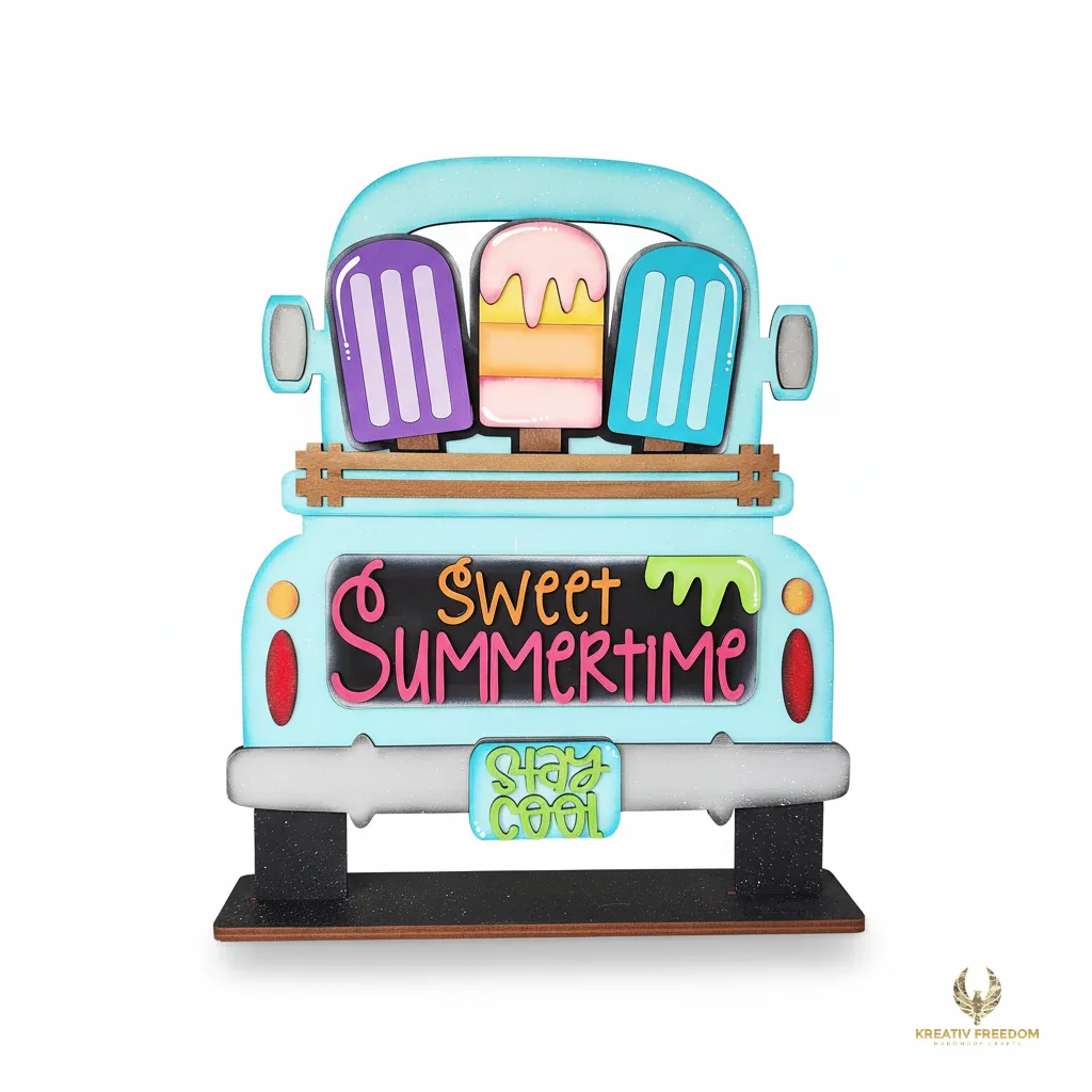 Welcome the Sweet Summertime vibes with our Popsicle Truck Wood Cutout. This charming piece from the Kreativ Freedom Monthly Collection is designed to be the highlight of your summer decor, offering a fun and creative project for all skill levels, whether you are decorating a tiered tray or a mantle.