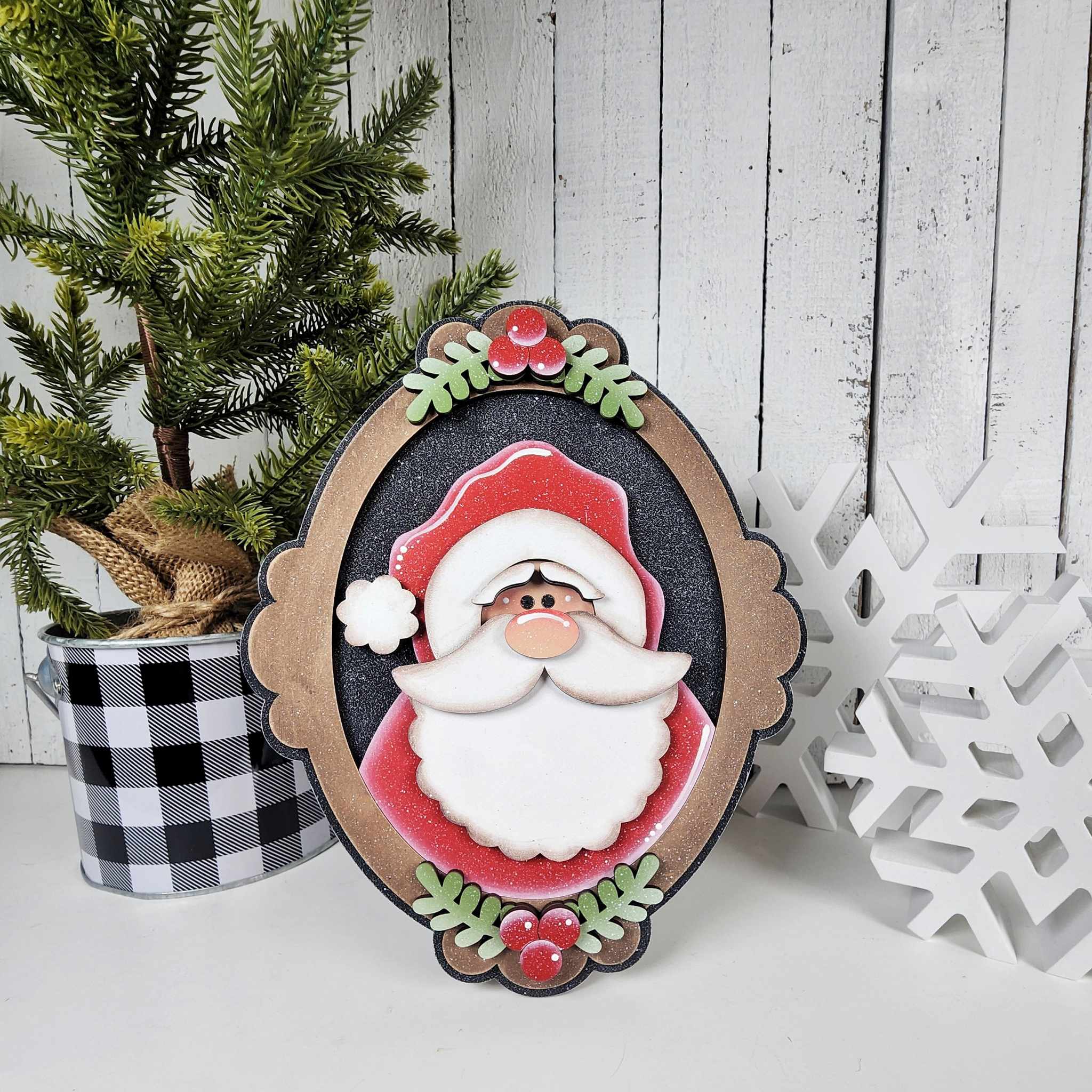 • Layered Frame Design — adds eye-catching depth and dimension that makes your finished Santa truly pop on any shelf or mantle.